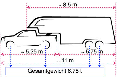Die Gesamtlänge des Fahrzeugs beträgt ca. 11 m bei einer Nutzungslänge von 8.5 m ist dies die beste Ausnutzung im Hängerbetrieb.